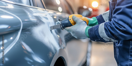 Mechanik, za pomocą specjalistycznego narzędzia szlifierskiego, starannie wyrównuje powierzchnię samochodu, zapewniając profesjonalne wykończenie po naprawach i wypadkach.