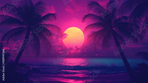 Palm Trees Silhouetted Against a Pink Sunset Over a Tropical Beach