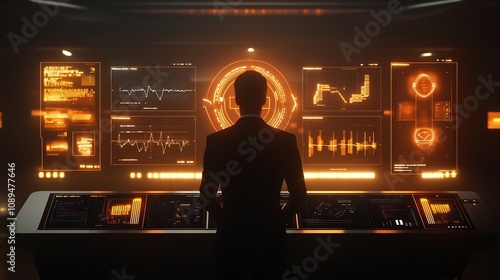 Professional corporate leader standing in front of a futuristic digital dashboard showcasing vibrant glowing icons related to ethics AI law and responsibility
