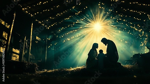 Silhouetted Silhouette of the Holy Family in a Rustic Stable Under the Radiant Bethlehem Star with Glowing Golden Light and Teal Hues Creating a Serene Spiritual Atmosphere
