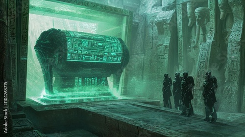 Futuristic Ancient-Egypt Holographic Sarcophagus in Ultra-Detailed Burial Chamber with Robotic Attendants