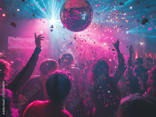 Zatłoczona sylwestrowa impreza z ludźmi tańczącymi pod kulą dyskotekową z neonowymi światłami.