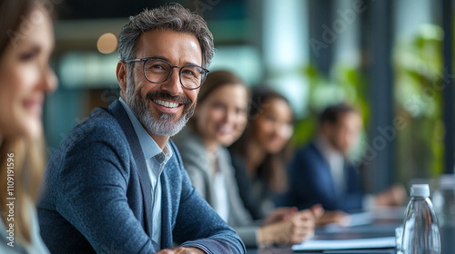 Uśmiechnięty mężczyzna, biznesmen, narada w biurze, tło generative ai