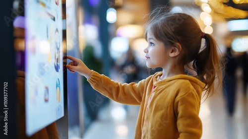 A young girl interacts with a digital screen in a bright, modern environment, showcasing curiosity and engagement with technology.