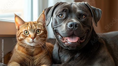 An image of a dog and cat happily hugging under soft lighting is perfect for promoting love, warmth, and harmony, evoking a sense of comfort and reassurance in viewers.