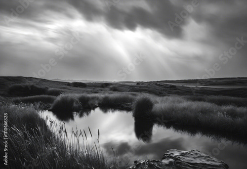 Scenic view of a tranquil river in a monochrome landscape under dramatic clouds at dusk