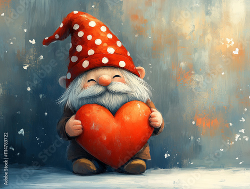 Krasnal w czerwonej czapce z kropkami i czerwonym sercem - Walentynki 14 luty