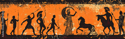 A Greek artistic composition featuring silhouetted warriors, a goddess figure, and a horse on orange and black background. The scene evokes themes of mythology, battle and ancient civilization