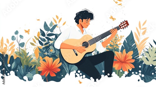 a 2D cartoon illustration of a classical guitarist playing in a garden, calm and musical, white background--ar 16:9