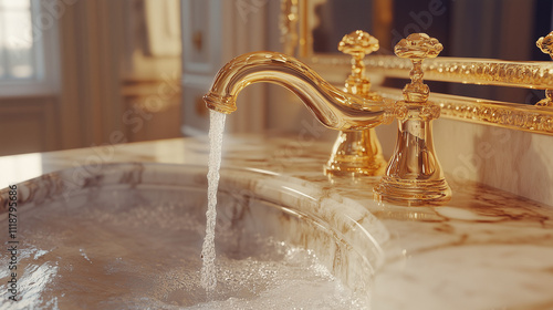 Złoty luksusowy kran z płynącą wodą nad marmurowym blatem.