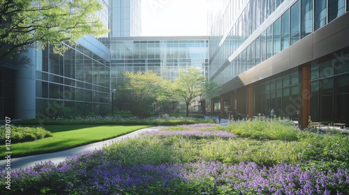 Sunlit urban courtyard with lush landscaping between modern buildings.