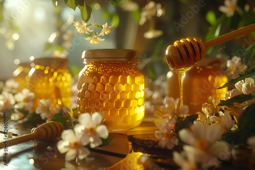 Słoiki wypełnione złocistym miodem ustawione w otoczeniu kwiatów i drewnianych nabieraków.