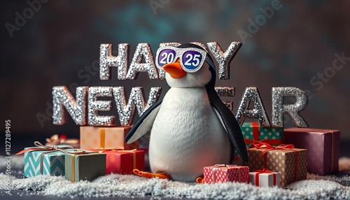 Playful male penguin adorned with shiny carnival glasses rady to new year party
