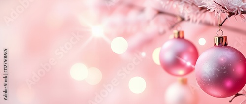 Delikatne różowe ozdoby świąteczne zwisające z oszronionej gałęzi, podkreślone ciepłym efektem bokeh na delikatnie różowym tle.