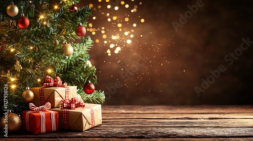 Santa Claus carefully placing a wrapped gift under a beautifully decorated Christmas tree with warm glowing lights and a clear area on the side for copy space or text overlay