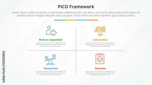 PICO framework infographic concept for slide presentation with matrix structure and line divider with 4 point list with flat style