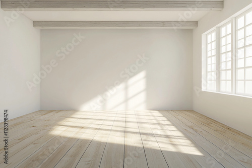 Une pièce vide avec des murs blancs, des poutres apparentes au plafond et un parquet en bois clair, éclairée par une lumière douce provenant de grandes fenêtres.