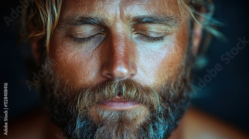 biblical character emotional close up portrait of a bearded man with eyes closed