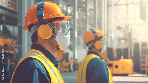 Construction workers with hearing protection, focused on tasks in noisy environment