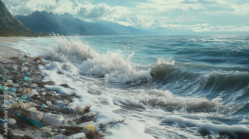 Fale uderzają o zaśmieconą linię brzegową, podkreślając dramatyczne zderzenie sił przyrody i śladów ludzkiej nieodpowiedzialności.