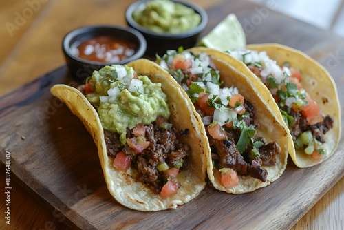 tacos, wołowina, kurczak, salsa, awokado, pomidor, limonka, guacamole, świeży, apetyczne, chili, kolendra, sałata, sos, mięso, tortilla, pikantne, warzywa, tacos z mięsem, rustykalny styl, sałatki, na
