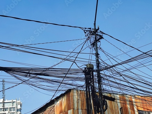 Low angle shoot of messy tangled cable electrical wire on utility pole against a blue sky .