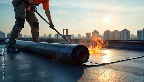 Worker installing bitumen roofing felt on flat roof. Uses tool to melt material. City buildings visible in background. Construction in progress on roof. Professional roofer using heat to adhere