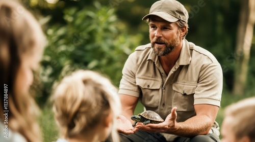 An instructor engages children in a learning session about turtles, framed by greenery, embodying elements of teaching, curiosity, and interaction in an educational setting.