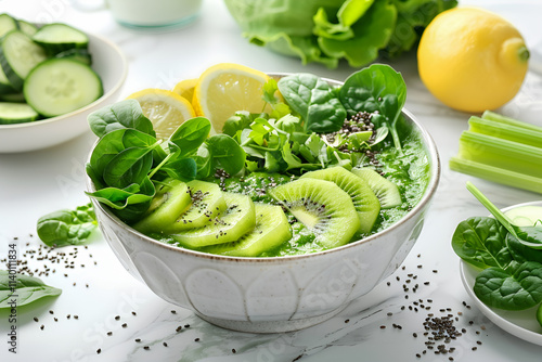 Świeża sałatka składająca się z plasterków kiwi, liści szpinaku, nasion chia i dodatku cytryny, podana w eleganckiej ceramicznej misce na jasnym tle.