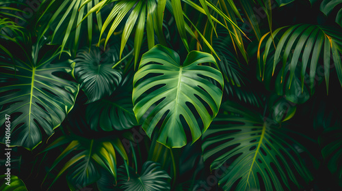 Une feuille de monstera verte au milieu de plantes tropicales.