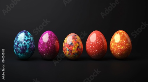 Pięć jajek z galaktycznym wzorem na ciemnym tle, inspiracja Wielkanocna