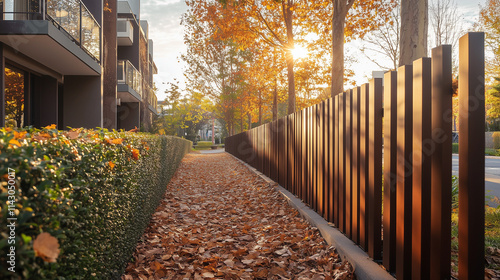 Ścieżka pokryta jesiennymi liśćmi prowadzi wzdłuż drewnianego płotu. Wokół rosną drzewa i krzewy oświetlone delikatnym blaskiem zachodzącego słońca.
