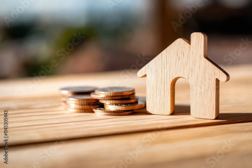 Wooden house figurine beside piles of coins on wooden surface, representing real estate investment, financial growth, and stability against a blurred natural background.