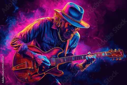 Musician playing guitar in a vibrant, colorful design with a stylish hat