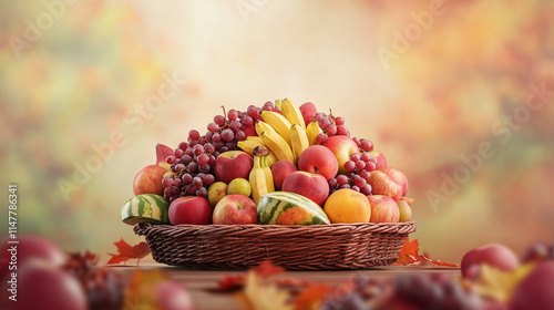 Kompozycja owoców w koszu, w tym jabłka, brzoskwinie, winogrona, banany i arbuz, na stole z jesiennym rozmytym tłem.