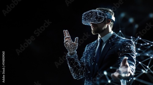business, people, augmented reality and network concept - businessman working with virtual low poly projection over black background