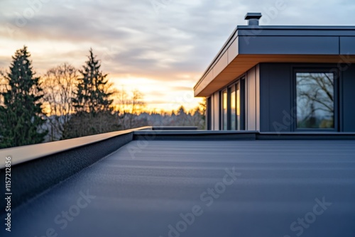 A sleek and modern flat roof is beautifully captured at sunset, highlighting the elegant lines and contemporary architecture against a backdrop of nature and sky.
