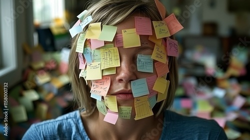 A woman with sticky notes all over her face, each note symbolizing a task or responsibility, depicting the mental exhaustion and overwhelm of modern-day life and the constant need to keep up.
