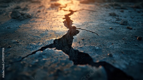 Earthquake causes ground to split open, revealing deep fissures at sunset