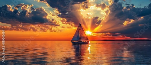 Golden hour serenity majestic sailboat drifts across the tranquil waters of lake superior amidst a stunning sunset display