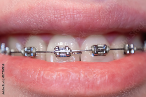 Modern dentistry: Metallic braces on teeth showcase advancements in orthodontics and the pursuit of a perfect smile. This treatment method with braces is suitable for both teenagers and adults.