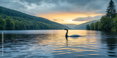 A mythical Nessie swims peacefully in the tranquil waters of Loch Ness, Scotland, during a breathtaking suns