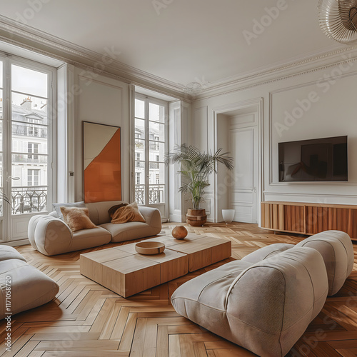 Salon design avec canapé bas, table en bois massif et grande baie vitrée.