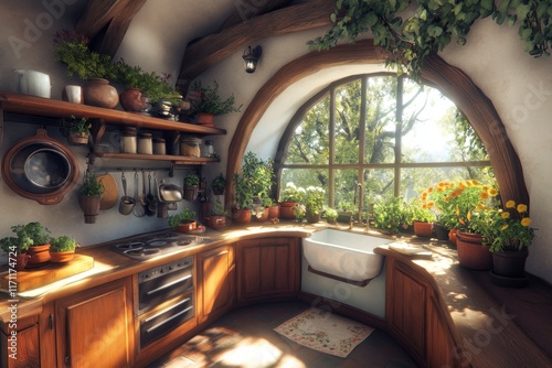 A magical kitchen in a fairy-tale setting, with floating utensils, glowing shelves, and enchanted herbs growing in pots