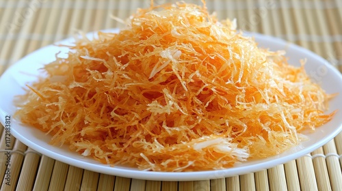 A clean plate of crispy chow mein noodles tossed with vegetables, placed on a rustic bamboo mat.