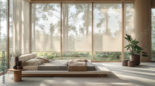 Modern bedroom, sheer shades, forest view, sunlight, interior design