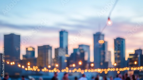 Lively Rooftop Party Overlooking Glowing City Skyline at Dusk