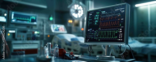 A state-of-the-art monitor displays vital signs and patient data in a modern hospital's critical care environment.