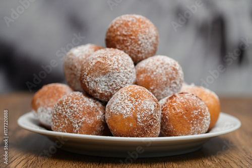 Mini pączki leżą ułożone w piramidę na talerzu z bliska