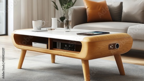 Smart coffee table with integrated wireless charging, touch screen controls, and hidden compartments
